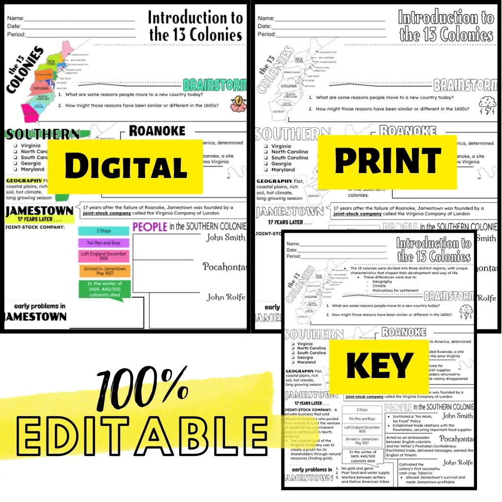 0 Slides (editable) with graphic organizer note-taking guide and summative assessment worksheet. This Google Slides provides a solid introduction to the 13 American Colonies. See below for the major topics reviewed.